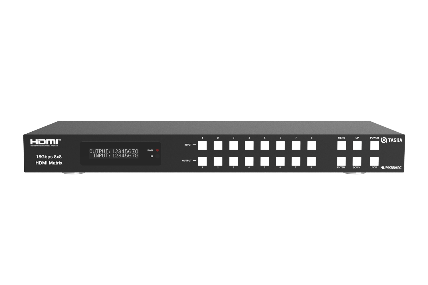 The HUMX88SL is a high-performance 8x8 HDMI seamless matrix switcher supporting 4K@30Hz resolution, designed for professional multi-source and multi-display applications. It features seamless switching, video wall splicing, EDID management, and multiple control options (front panel, IR remote, RS-232, and Web GUI). Equipped with an analog audio output port, it synchronously outputs extracted audio signals following the OUTPUT HD1 interface. All 8 HDMI outputs support independent brightness and contrast adjustment, making it ideal for meeting rooms, command & control centers, multimedia showrooms, control rooms, and more.