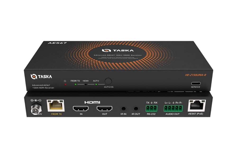 Taska HE-2150UMD-R is a 4K HDBaseT Receiver. It allows you to reliably transmit high-definition audio, video, and control signals over a single CAT6/6a cable. It supports stunning video quality up to 4K@60Hz 4:4:4 and can extend your signal up to 120 meters for 4K content and 150 meters for 1080p content.