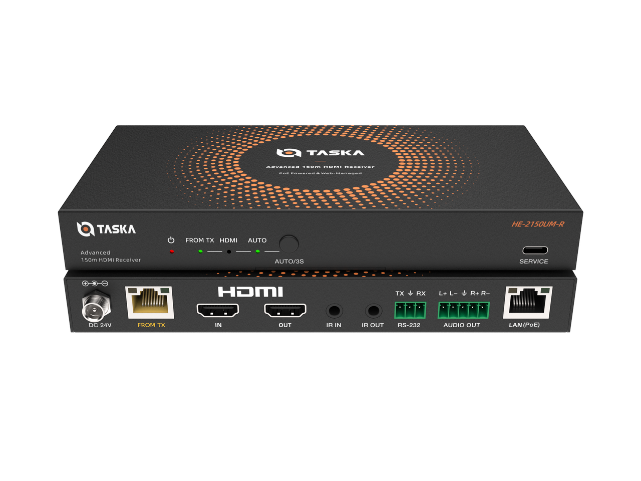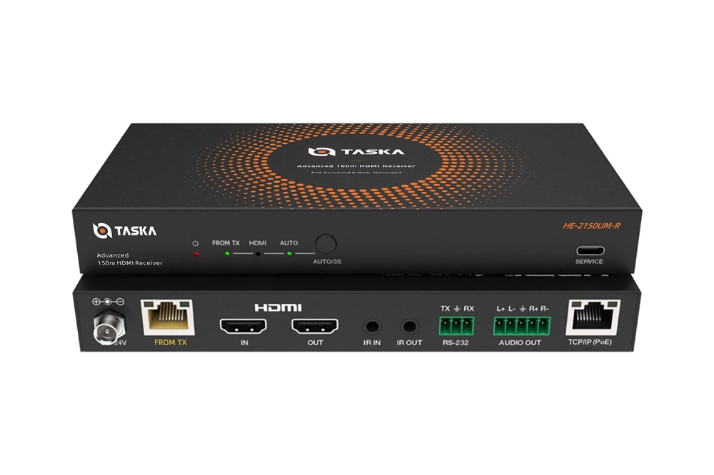 Taska HE-2150UMA-R is a 4K HDBaseT Receiver. It allows you to reliably transmit high-definition audio, video, and control signals over a single CAT6/6a cable. It supports stunning video quality up to 4K@60Hz 4:4:4 and can extend your signal up to 120 meters for 4K content and 150 meters for 1080p content.