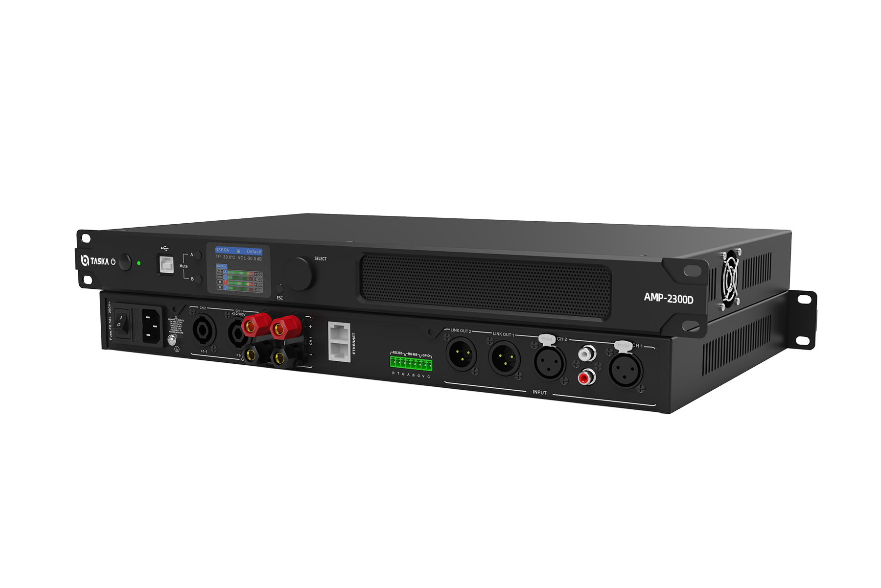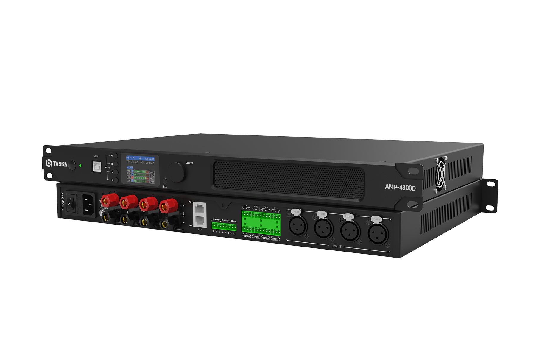 The AMP-M1100D is a digital amplifier equipped with multiple audio inputs and mixing capabilities. It can connect two microphones and one line-level signal, with independent volume control knobs for each input channel. This amplifier offers exceptional audio performance and stability, making it ideal for small spaces such as classrooms, shops, training rooms, and meeting rooms. Featuring a highly efficient Class-D output stage, the AMP-M1100D delivers clear, dynamic, and precise sound quality. The amplifier's rear panel includes the popular Dante digital audio networking interface, enabling seamless integration with professional audio DSPs, digital mixing consoles, or Dante sound cards for computers. This makes it suitable for a variety of local sound reinforcement and video conferencing applications.