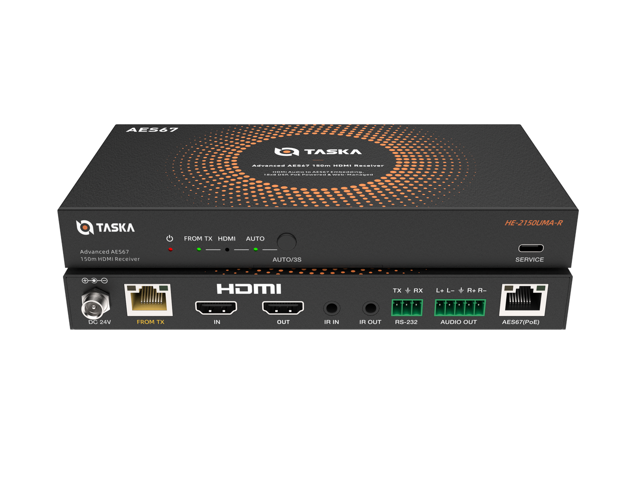 Taska HE-2150UMD-R is a 4K HDBaseT Receiver. It allows you to reliably transmit high-definition audio, video, and control signals over a single CAT6/6a cable. It supports stunning video quality up to 4K@60Hz 4:4:4 and can extend your signal up to 120 meters for 4K content and 150 meters for 1080p content.